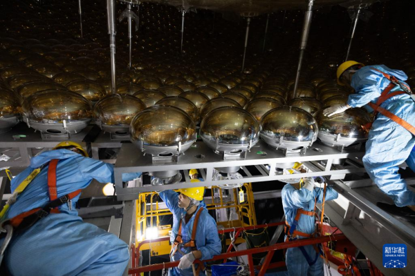 10月9日,工人在安装中心探测器上的光电倍增管。新华社记者 金立旺 摄