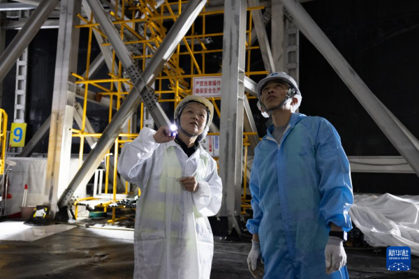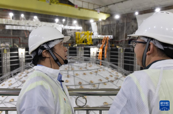 10月10日,项目总工程师马骁妍(左)和工作人员在江门中微子实验中心探测器水池底部沟通施工进展情况。新华社记者 金立旺 摄