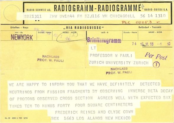 1956年,这项实验由美国物理学家费雷德里克·莱茵斯和克莱德·科万完成。他们选用氢核(质子)作为靶,通过探测中微子与质子的反应,直接证实了中微子的存在。莱茵斯因此于1995年获得了诺贝尔奖(让人遗憾的是,科万于1974年去世了,否则他也有机会分享此殊荣)。下图所示内容为,两位科学家宣布发现中微子的电报。