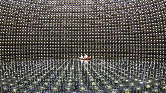 到了20世纪90年代,神冈探测器进行了第二次扩建,这一次规模扩大了10倍,用了5万吨超纯水和11200个光电倍增管,并改名为气势十足的超级神冈探测器。1996年,超级神冈探测器开始取数。超级神冈探测器也通过切伦科夫光来探测中微子,除了太阳中微子,超级神冈实验主要用来探测大气中微子信号。这种中微子是宇宙线轰击地球上层大气的产物,以两种类型出现,分别是电子中微子和缪子中微子。超级神冈探测器可以区分由上方大气层产生自上而下穿过的中微子和由地球另一端的大气层产生自下而上穿过的中微子。测量结果显示,传播不同距离的中微子的数目也不同,也就是中微子在传播中发生了振荡现象(之后更精确的的数据分析表明,主要是其中的缪子中微子主要转变成第三种中微子,即陶子中微子。)。 1998年,超级神冈实验的领导人之一,小柴昌俊先生的学生梶田隆章在中微子1998会议上发表了实验的测量结果,第一次证实了中微子振荡现象的存在。虽然最初的目标质子衰变并没有探测到,但神冈和超级神冈实验“幸中副车”,凭借物理学家们严谨勤奋的研究,收获了丰硕的成果。2002年,小柴昌俊由于观测到1987A超新星中微子和前文提到的雷·戴维斯分享了诺贝尔物理学奖。