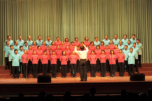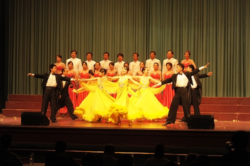 随后,由王湘鉴、张敏、江亚欧、朱威四位同志担任主持的文艺演出正式开始。工厂的大合唱《中国中国鲜红的太阳永不落》《咱们工人有力量》为演出拉开了帷幕,继而各单位选派的节目相继登场。今年的文化广场紧扣“庆祝建国60周年”这一主题,歌唱祖国、祝福祖国的节目占据主导地位,形式以大合唱、联唱、集体舞、朗诵为主,充分体现了全所上下迎接祖国母亲六十华诞的喜悦、激动心情。多位所领导、处室领导不仅高度重视,而且积极参与,甚至担任表演主力,成为演出中的一抹抹亮色。各单位参与热情高涨,精心组织、全情投入,节目内容在紧扣国庆主题的同时,创新表演方式,花样翻新,异彩连连,既有绚烂多姿的歌舞联唱,又有大气磅礴的集体舞蹈,既有学生原创的诗歌朗诵,有童声领唱的惊喜亮点, 又有离退休老同志激情澎湃的的大合唱和精彩舞蹈,还有个唱、独奏、快板等节目点缀其中,呈现出一台台精彩纷呈的视听盛宴,将演出一次次推向高潮。在各个精彩节目的带动下,现场气氛十分热烈,观众时而为嘹亮高亢的大合唱击掌伴奏,时而为集体舞的精湛技艺发出阵阵喝彩,时而沉浸在感恩温情的诗歌朗诵和柔和动人的歌声、琴声中,时而对节目表现出的积极向上的良好风貌赞叹连连,不仅观赏了一场多姿多彩的文艺演出,而且共同在高能所大集体中经历了一次深刻而生动的爱国主义洗礼。本次文化广场还有一个独具匠心的设计,那就是在观众席的左、右前方各悬挂了两幅大型投影幕布,演出前滚动播出了喜迎国庆、中秋佳节的幻灯片,提前预热了节日气氛,演出中与主持人报幕同步展示节目名称、参演单位、表演者等,并在高能所集体舞《辉煌的对撞机工程》表演中同步播放了相关图片和视频,使得观众既可以对节目进程一目了然,又能够享受到双重的感染力和震撼力。