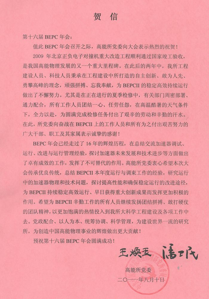 值第十六届BEPC年会召开之际,高能所党委发贺信表示祝贺,贺信全文如下: