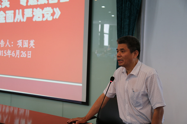 项国英的专题党课着重讲了“全面从严治党”问题。他讲了“全面从严治党”提出的背景和重大意义,回顾了中国共产党94年的光辉历程,从理论和实际二个方面阐述了“为什么要从严治党”以及“如何从严治党”等重大问题。项国英指出,全面从严治党是党自我纠错、自我提升、自我净化的过程,是加强党风廉政建设、治国理政的治本之策。全面从严治党要求领导干部以上率下、坚持以问题为导向,并结合自身实际工作中存在的问题,提出整改思路与措施,同时,要从“五位一体”的总体布局出发,把党的思想建设放在首位,着力作风建设,从严治党,捍卫党纪,营造风清气正、凝心聚力的党风高地。