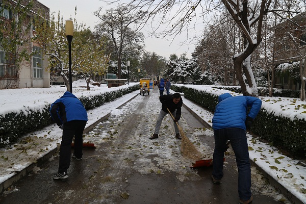 11月23日清晨,高能所园区内银装纷繁,园区主要干道被积雪覆盖,交通不便。为方便大家出行,以保证车辆和行人的安全,高能所组织党员职工清扫积雪。