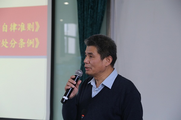 党委书记潘卫民主持会议。纪委书记魏龙讲了“深入学习贯彻《中国共产党廉洁自律准则》和《中国共产党纪律处分条例》”的专题党课,从充分认识学习贯彻“两规”的重要意义、主要内容及其特点,中央纪委 “两部党内法规”权威答疑四个方面进行了阐释。党课对《准则》中的“四个必须”“八条规范”和《条例》的“六大纪律”进行了重点说明,点明了所内科研实际情况和日常生活中要着重注意的事项。他希望全所党员领导干部继续支持党委纪委工作,发挥好表率作用,带头学习、带头宣讲、带头贯彻执行“两规”精神,对违反纪律行为抓早抓小,真正把纪律立起来、严起来、执行到位。