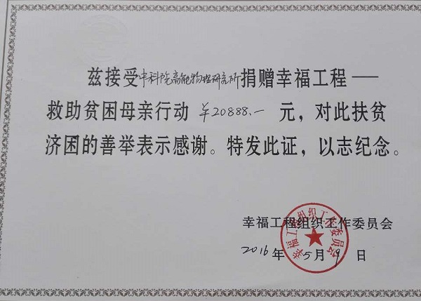 2016年是中央国家机关人口和计划生育委员会组织开展“幸福工程——救助贫困母亲行动”的第19年。今年,中科院高能所各部门认真贯彻习近平总书记“精准扶贫”重要指示,从党的十八届五中全会关于“实施脱贫攻坚工程”战略部署的高度出发,认真组织开展“幸福工程—救助计划生育贫困母亲行动”捐款活动,全所有332人参与捐款,共计20888元。款项已于5月9日由高能所计生办上交到中科院人口和计划生育委员会办公室。