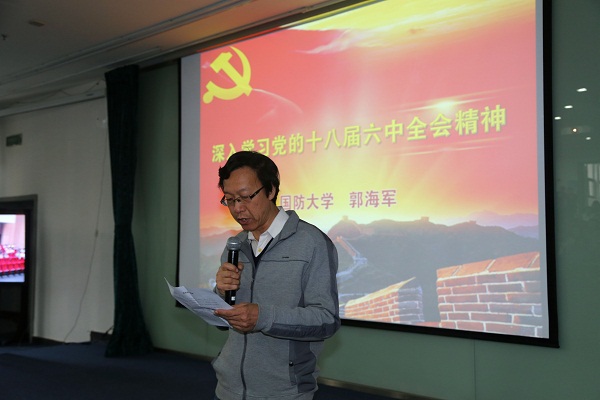 报告会由罗小安主持。国防大学马克思主义教研部科学社会主义教研室副主任郭海军应邀作报告。报告从推进全面从严治党的紧迫性和必要性、明确习近平总书记的核心地位、加强监督的政治生活和强化落实党内监督责任四个方面介绍了十八大以来中共中央对党的建设的系统部署,强调了党内政治生活、党内监督,关键少数、纪律严明和选人用人等举措对全面落实党内监督责任的现实意义。