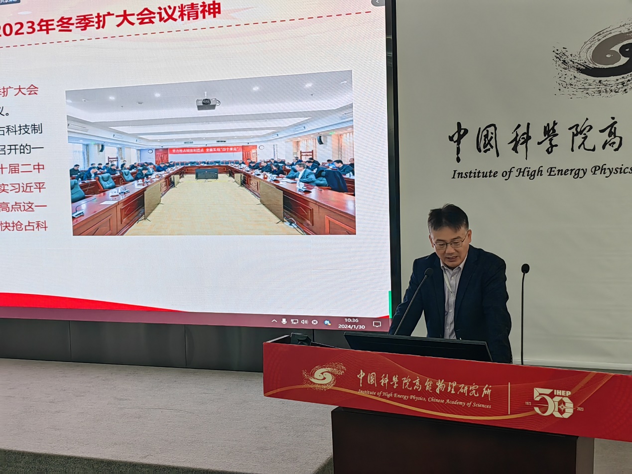 首先,葛锐带领大家学习了“中共中国科学院党组2023年冬季扩大会议精神”、“侯建国院长在中国科学院2024年度工作会议上的讲话”以及“2024年所工作会精神”。通过学习,与会党员领会了习近平总书记系列重要讲话和指示批示精神,增强了抢占科技制高点的使命感、责任感和紧迫感,并对高能所在2024年的重点工作有了更加深入的了解。