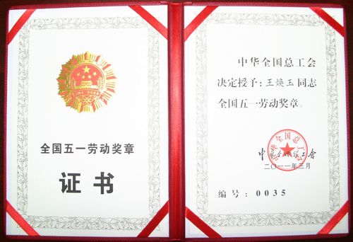 中华全国总工会授予王焕玉“全国五一劳动奖章”