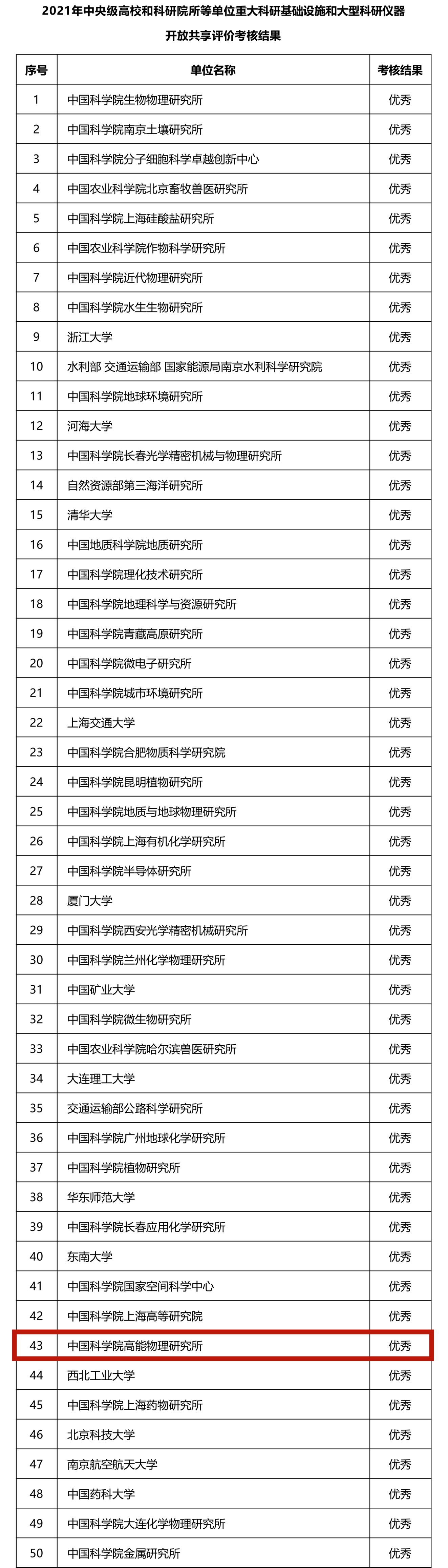 日前,科技部办公厅、财政部办公厅发布2021年中央级高校和科研院所等单位重大科研基础设施和大型科研仪器开放共享评价考核结果。本次考核涉及全国25个部门346家单位,其中50个单位考核结果为优秀,100个单位考核结果为良好,188个单位考核结果为合格,8个单位开放共享情况较差。高能所在此次考核评估中获得“优秀”的评价结果。这是高能所继2018年、2020年之后,第三次获得该项考核优秀。