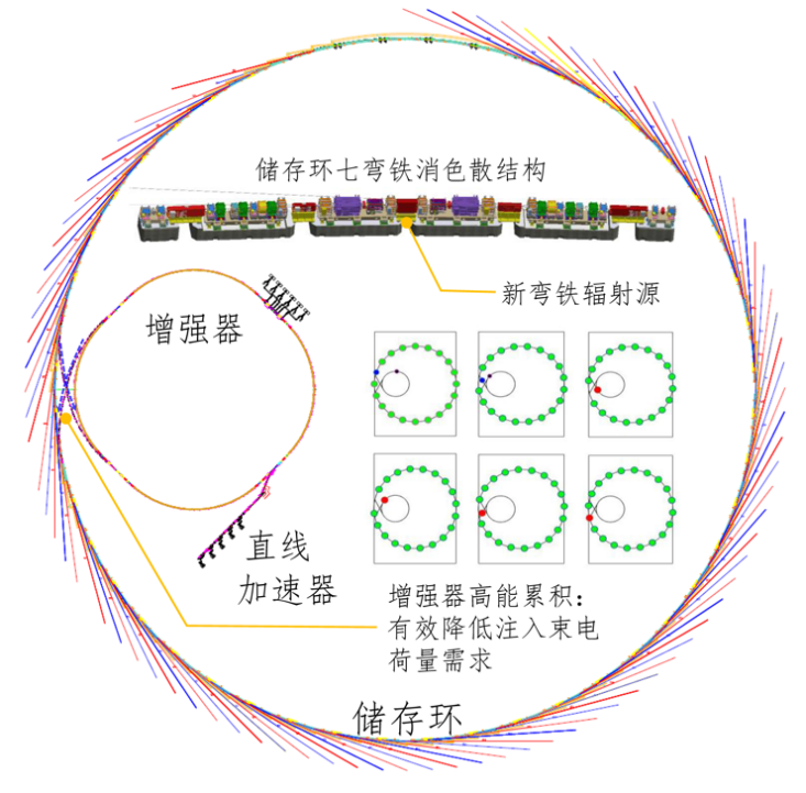 发展了新型磁聚焦结构、新弯铁辐射源的设计方法,提出基于高能累积的置换注入等方法,完成超低发射度的储存环整体物理设计,实现电子束自然发射度34pm∙rad,国际同类光源中指标最高。
