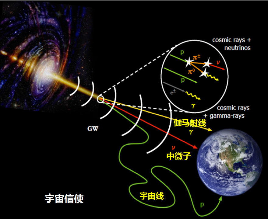 带电宇宙线、高能中微子、高能伽马射线传播示意图