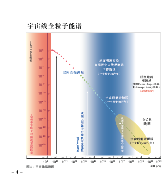 在1011eV处,每平方米每秒有一个宇宙线粒子,在这个能量附近可以将探测器放在卫星或高空气球上,在大气层顶部对宇宙线进行直接探测,但是随着能量升高,流强下降,如在1018eV能量左右处,每平方公里每年才有一个宇宙线粒子,对于这么稀少的宇宙线,需要在地面用更大的探测器进行间接探测。