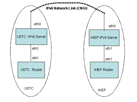USTC Server的IPv6地址为IPv6-USTC,IHEP Server的IPv6地址为IPv6-IHEP,两台服务器之间通信使用UDP端口5000,同时,两台服务器作如下配置: