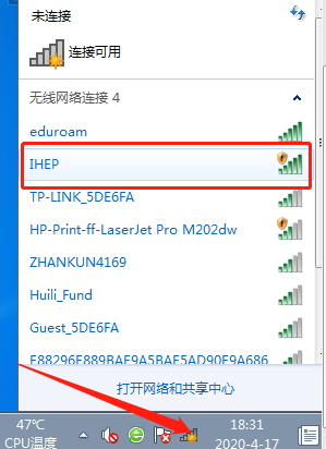 为了方便访问人员使用网络资源,高能所计算中心针对来访人员提供了无线网络接入服务,来访人员打开笔记本,选择高能所无线网络SSID(IHEP),如图1所需,连接高能所无线网络。