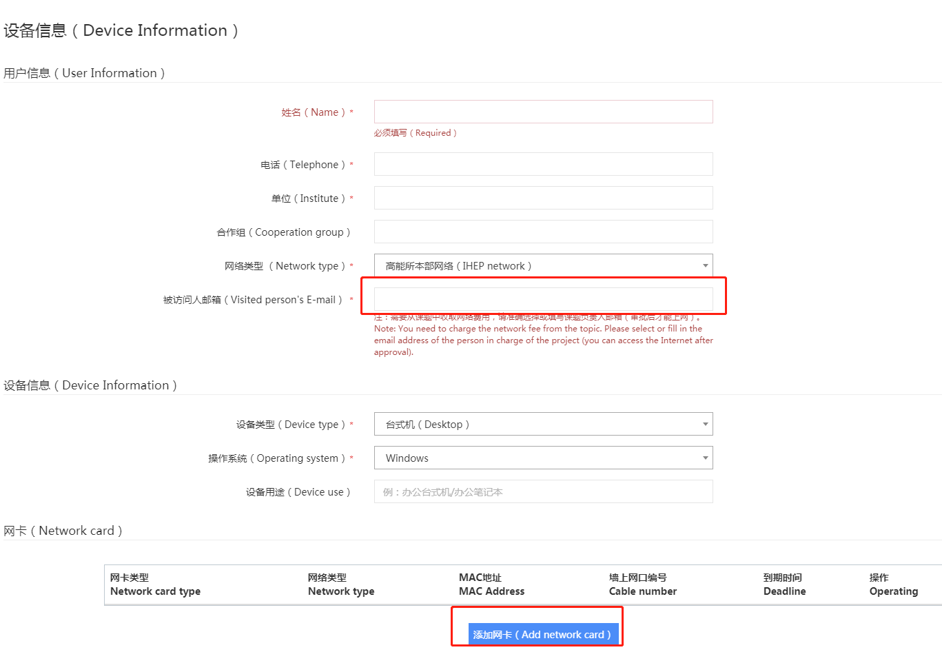 如果设备未注册,浏览器输入人员网站会自动弹出注册页面(若未弹出可以浏览器输入 http://network.ihep.ac.cn),选择“3、短期来访类型”(如图1),并勾选(同意)“我已阅读并同意遵守《高能所网络环境使用条例》”,点击继续,输入您的邮箱,点击继续,填写正确个人信息,填写正确被访问人邮箱(高能所邮箱),并添加无线网卡,点击添加后继续,然后提交,等待审批邮件通知。