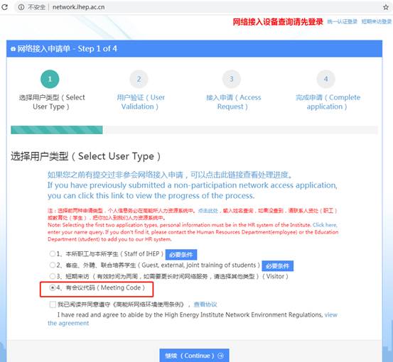 用户在高能所所内使用无线上网时,连接高能所无线SSID(IHEP),如果是非注册用户,浏览器会自动弹出注册页面(若未弹出可以浏览器输入http://network.ihep.ac.cn),选择“3、短期来访类型”(如图1),按照注册页面提示填写正确信息进行注册并提交,等待审批通知邮件。