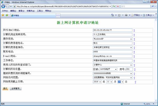2、在表中填入个人相关资料,点击“提交”后,等待管理员审核确认(工作时间内),计算中心管理员通过邮件或电话通知用户。您也可以电话联系计算中心(电话6029 管理员:吴玲),尽快获取已分配的IP地址信息;