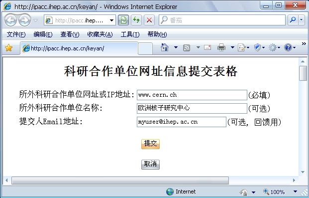 1. 请输入所外科研合作单位网址或IP地址(必填),所外科研单位名称(可选)以及提交人邮箱地址(可选)