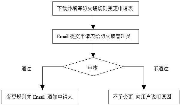 放在DMZ区的服务器根据需要开放不同的端口与外网互相访问。如果用户有特殊需求,要求改变防火墙访问规则,请按照下列流程递交申请给防火墙管理员,并等待答复。