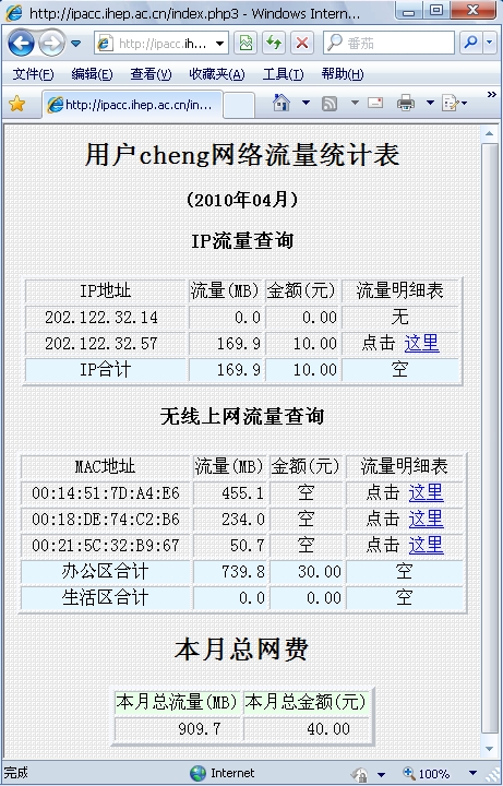 页面分别显示固定IP和无线上网流量。其中“流量明细表”一栏,点击“这里”可以查看相应流量的明细表。