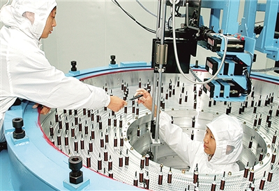 科研人员正在进行北京谱仪主漂移室信号丝的安装。