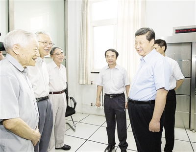 7月17日,习近平到中国科学院考察工作。这是习近平同当年参与北京正负电子对撞机建设和应用的3位院士交谈。 新华社记者 李学仁摄