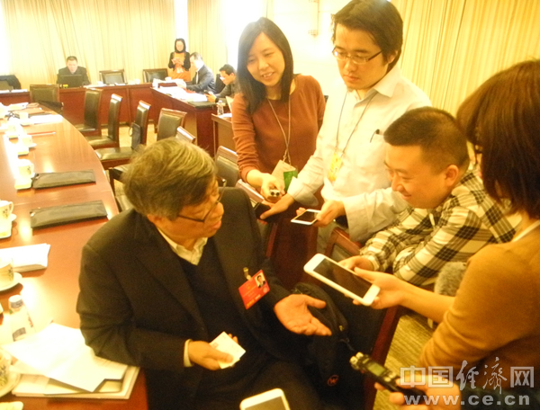 陈和生代表(左一)在接受记者们采访。(中国经济网记者 佘惠敏 摄)