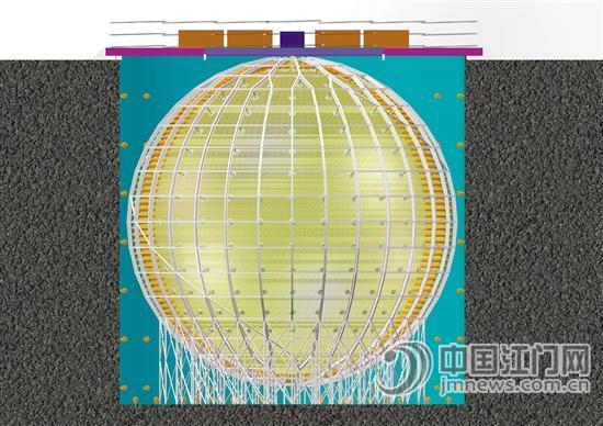 而整个实验的核心,是在比两个篮球场还长的地下实验大厅里,建造一个直径逾35米的球形探测器,即中心探测器,并要把中心探测器浸泡在一个直径约43米的圆柱形水池中。中心探测器内部要灌装2万吨液体闪烁体,并安装18000只20英寸的光电倍增管等。