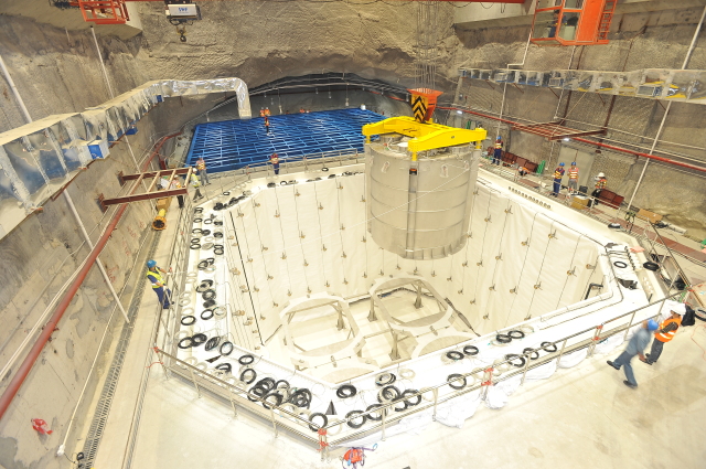 图:3号实验厅中,110吨重的中微子探测器正在吊装入10米深的水池中