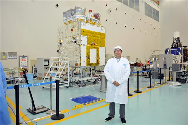 中科院高能物理研究所研究员、硬x射线卫星首席科学家张双南与“慧眼”号卫星合影。(中科院高能物理所供图)