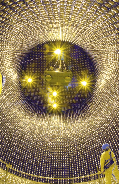 日本超级神冈中微子探测器(Super-Kamiokande)位于一个深达1000米的废弃砷矿中。其容器的内壁上安装有11200个光电倍增管。