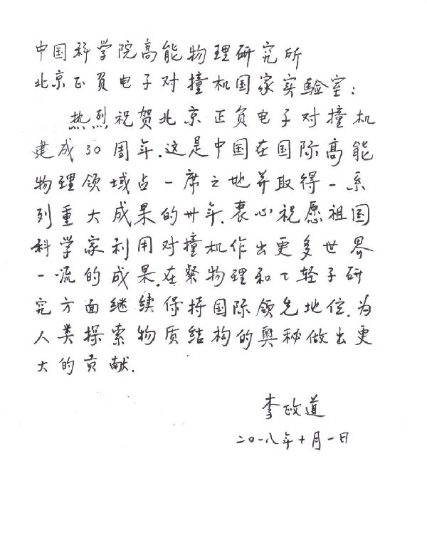 李政道在贺信中写道:北京正负电子对撞机建成的30周年,这是中国在国际高能物理领域占一席之地并取得一系列重大成果的30年。衷心祝愿祖国科学家利用对撞机作出更多世界一流的成果,在粲物理和τ轻子研究方面继续保持国际领先地位,为人类探索物质结构的奥秘做出更大的贡献。