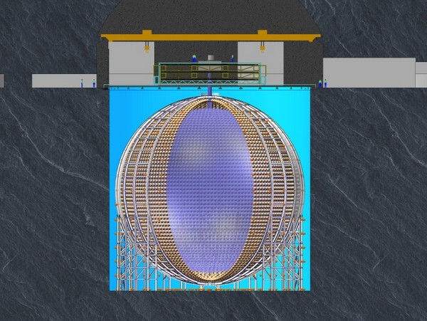 根据设计方案,JUNO会由265块有机玻璃板现场组装而成,并被钢架固定在一个装有约4万吨纯净水的大池中。