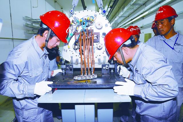2014年10月15日,中国散裂中子源首台设备负氢离子源下隧道安装。中科院高能所东莞分部供图