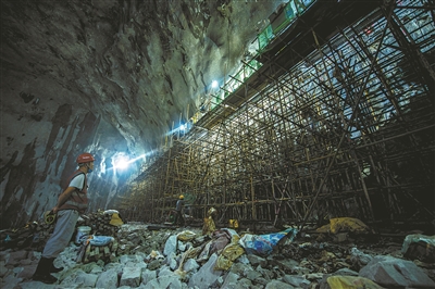 李小男介绍,大厅拱顶跨度50米,当时大家心里没有底,为保证结构稳定,采用了各种支护,为此耗费了很长时间。而更困难的是,大厅顶部有一条宽度达20厘米的花岗岩断层,施工前,工人们把大厅的位置已经移动了30米,但还是躲不开,因为这条断层横跨整个大厅,施工耗费了很多时间,每打一个孔就会漏水,在这种情况下施工难度特别大,必须要把水先堵上。