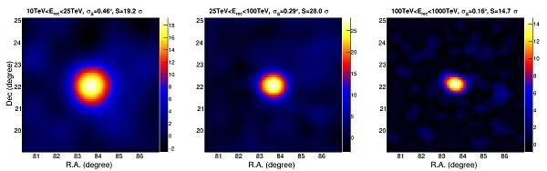 LHAASO平方公里阵列在10-25TeV、25-100TeV和100-1000TeV三个能段观测到的Crab显著性天图。中科院高能所 供图