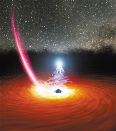 研究团队指出,目前对这一现象最合理的解释是:冕在收缩的同时,冕中的等离子体流正在以接近光速向外运动,这为研究团队已经发现的离黑洞很近的相对论喷流提供了独立的观测证据和物理解释。“我们的研究成果不仅探测到了冕背离黑洞向外运动,更重要的是,我们首次发现,当冕的空间尺度在收缩时,其运动速度逐渐增加。”游贝说。