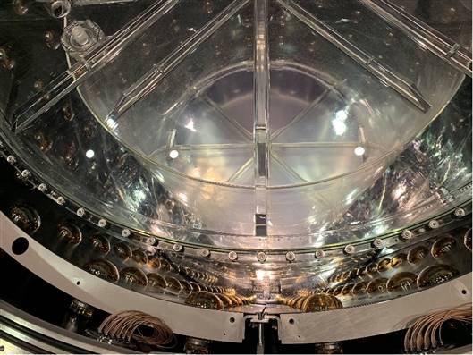 钢罐被泡在盛着碧蓝色超纯净水的大水池中,罐顶处于水下2.5米深。大水池内壁上也装着光电倍增管,上千只光电倍增管像大灯泡一样被装在紧贴着水池内壁的不锈钢支架上。此外,还有成千上万根电缆,血管般密密麻麻地连接在探测器各部位之间。