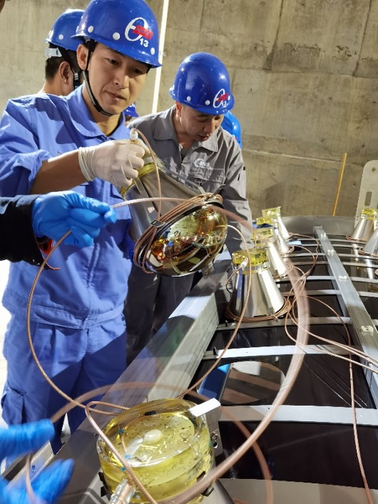 工作人员从梯架上拆下光电倍增管(高能所供图)