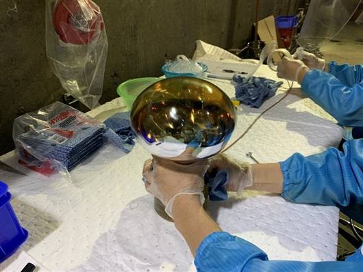 工作人员先把水池里的水抽空,在每个探测器上安装好管道和设备,把重达80吨的三种液体通过管道同步抽出。接着,他们打开探测器的钢盖,把在油里泡了近十年的光电倍增管阵列撤出来,又把嵌套在钢罐里的两个有机玻璃罐整体吊出。然后,他们穿上防油防滑服,爬进钢罐里,拆除底部的其他零件并清理内部残留的白油,最后,再吊出钢罐。与此同时,他们还需要把水池内壁钢架上的光电倍增管一个个摘下来,并对所有光电倍增管逐一检查、清理、装箱。