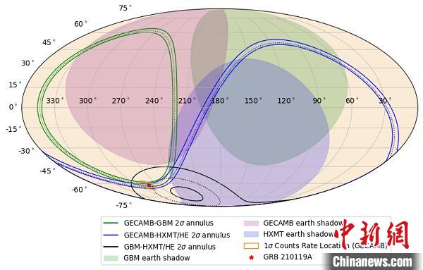 与此同时,科研团队利用“极目”卫星自身的观测数据对该爆发事件进行定位,并对“极目”卫星、“慧眼”(HXMT)卫星以及美国费米(Fermi)卫星的数据进行联合分析,结果显示,“极目”卫星单独定位和联合定位结果,都跟具有成像能力的美国雨燕(Swift)卫星的精确定位结果一致,这也初步验证了“极目”卫星观测数据的准确性以及定位能力。