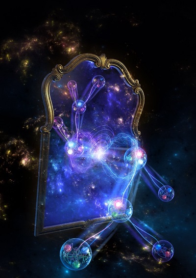 正反科西超子级联衰变演示图:如果物质和反物质遵循相同的物理法则,科西 超子与反科西超子的衰变应该是镜像对称的,只是空间坐标是相反的。镜像之间纽带 连接表示正反超子的量子关联。