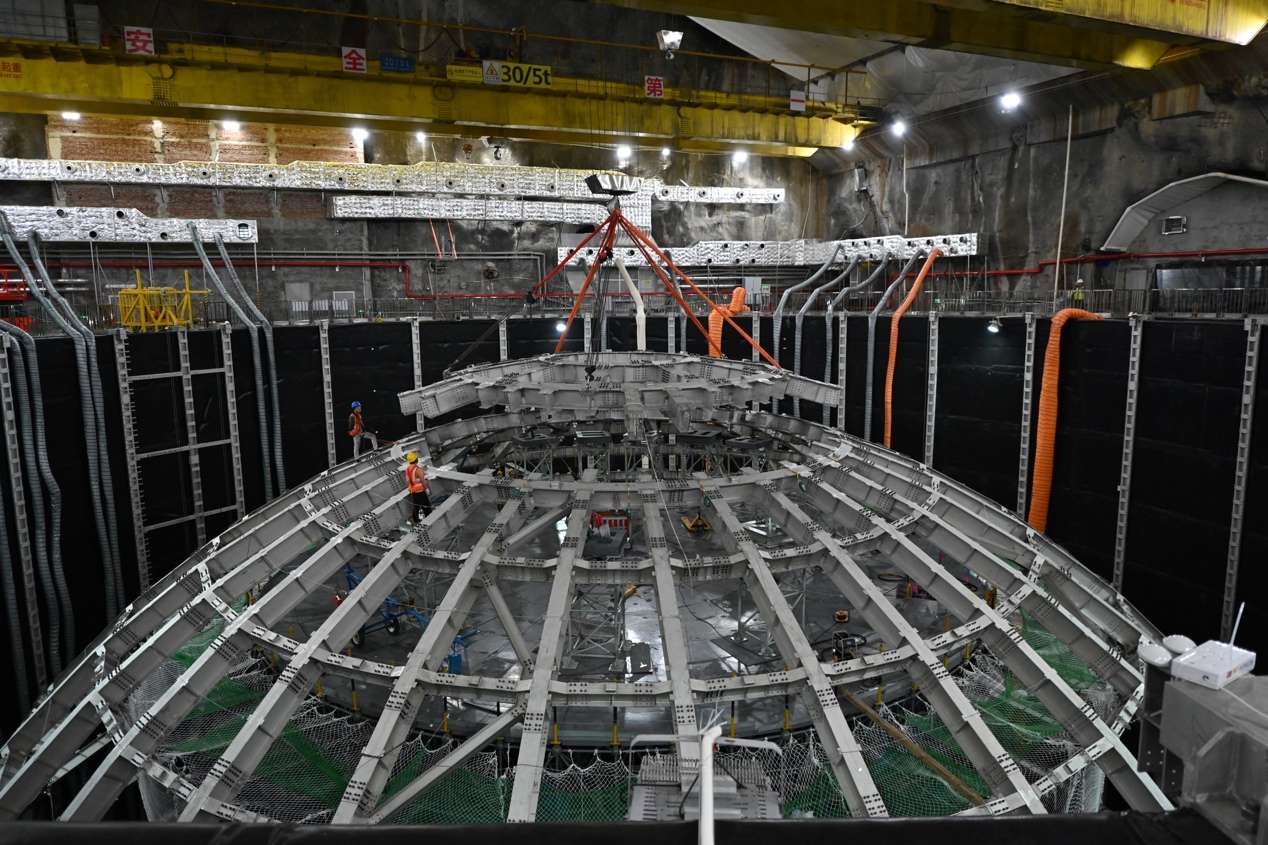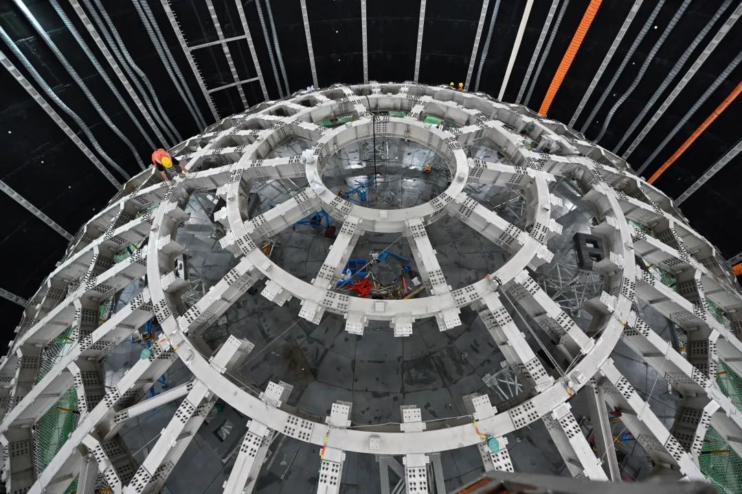 6月24日,江门中微子实验地下700米的实验大厅内,中心探测器不锈钢主结构最后一个拼装单元吊装合拢,标志着中心探测器不锈钢主结构安装工作顺利完成。