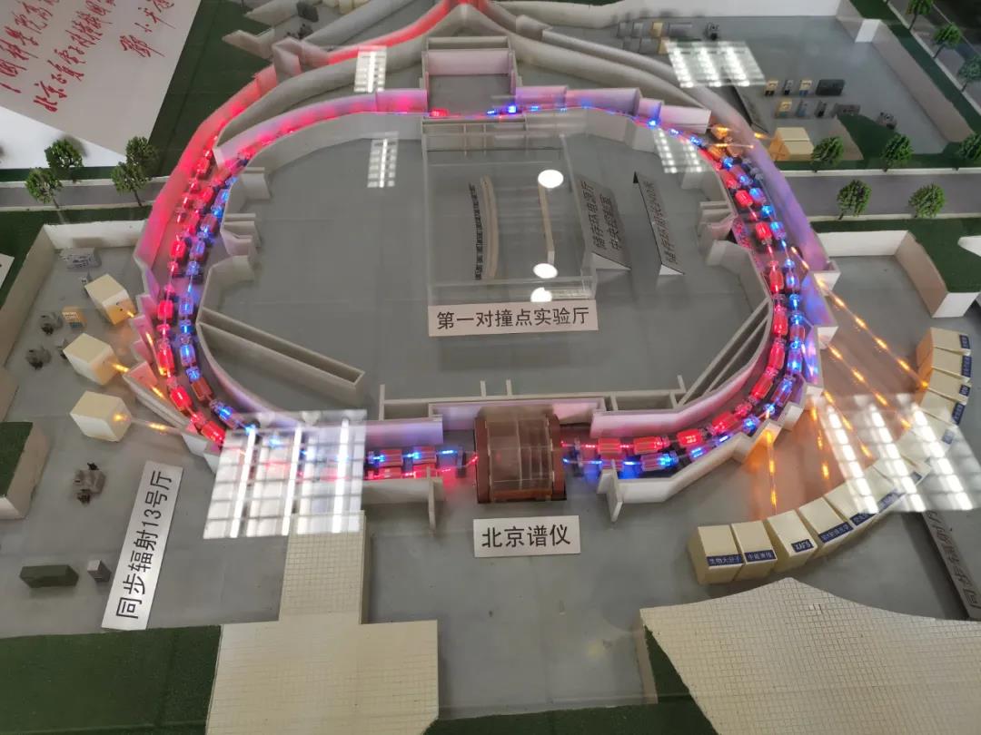 进入北京正负电子对撞机主控大厅,不断闪烁的对撞机重大改造工程实景沙盘格外引人注目。从沙盘模型上看,北京正负电子对撞机的外形像一支硕大的羽毛球拍,由四大部分组成,包括注入器、储存环、北京谱仪以及北京同步辐射装置。