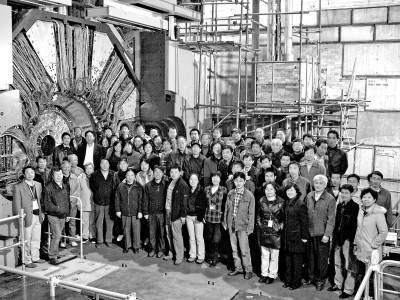 北京谱仪Ⅲ的子探测器——漂移室建造完成后,参研人员合影留念。资料图片