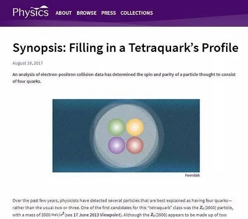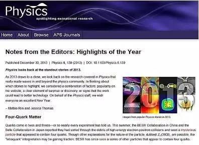 2013年12月30日,美国物理学会主编的《物理》杂志公布了2013年国际物理学领域重要成果,北京谱仪III国际合作组“发现四夸克物质”在11个入选项目中位列第一。