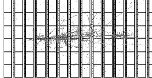 上图为模拟OPERA中的τ中微子相互作用。束流从左边进入并撞击砖块壁中的原子核。每个壁后面都跟随与束流垂直的靶寻迹器平面。右边溜走的长轨迹是μ子。
