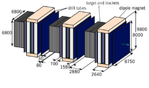 每个可抽取的砖块,重8.3公斤,尺寸为10.2 x 12.7厘米(与束流横向)和7.5厘米(沿束流方向),由56个单个单元组成。探测器壁由3264块砖块组成,有两个电子寻迹器(塑料闪烁体由波长转变光纤读出)平面,构成一个模块。每个靶超级模块24个模块组成,与束流垂直的截面约为6 x 7 米的整个探测器有3个超级模块,共235000块砖块。