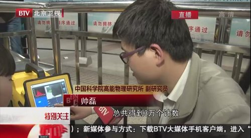 2014年4月22日,北京电视台录制了一期专题节目,针对人们日常生活中每天都会遇到的地铁安检设备的辐射性及其是否会对人体造成危害等问题进行了专门的报道,应北京台之邀,我们的科研人员利用自主研发的射线成像仪和剂量监测仪将安检设备的辐射性定量的呈现到了公众面前。根据我国的《电离辐射防护与辐射安全基本标准》(GB18871-2002)规定,公众受到的人工辐射的年平均有效剂量的估计值不能超过1毫希伏特,经过我们的设备探测,大概位于半米的距离,大概的辐射剂量是0.2微希伏,估算每个人在365天中上下班乘坐地铁,一年中安检仪旁累计的辐射剂量大概是0.012毫希伏,远远地低于国家的安全标准。(视频及截图如下)